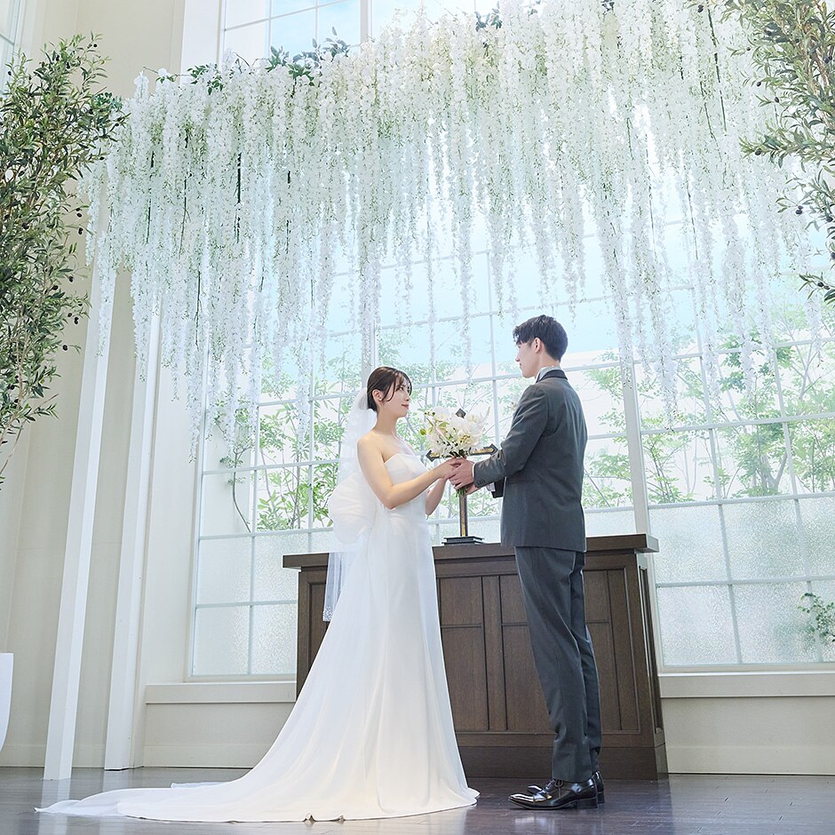 白を基調とした清楚なチャペルがより美しくなってふたりをお迎え。青空も祝福してくれる開放的な空間で叶えるアットホームな挙式は、ハープ演奏やバブルシャワー、愛犬も参加など、記憶に残るオリジナル演出も人気