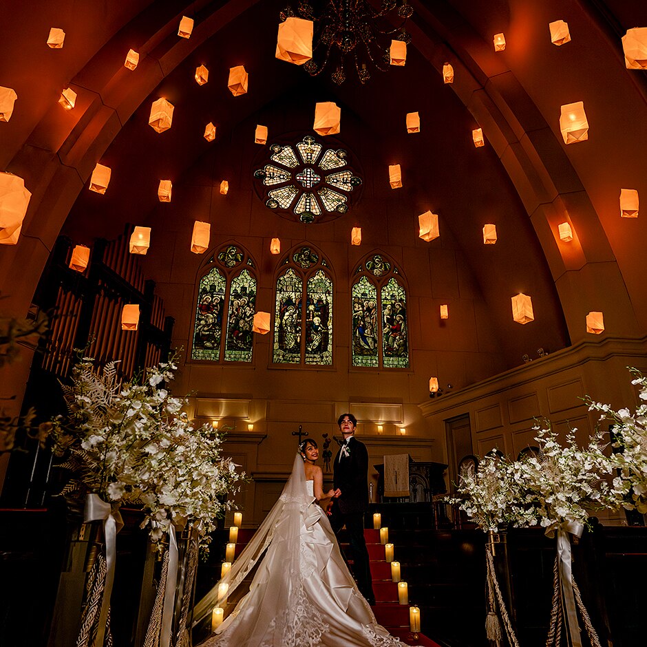 天井高12m×22mもの深紅のバージンロードが美しい英国大聖堂、前撮りと当日で組合せ自由!何着でも衣裳着放題の【2名で24万2000円プラン】、高さを活かしたランタン演出など魅力満載!もてなし料理は約12 万通りのプリフィックススタイルから自由にセレクト!