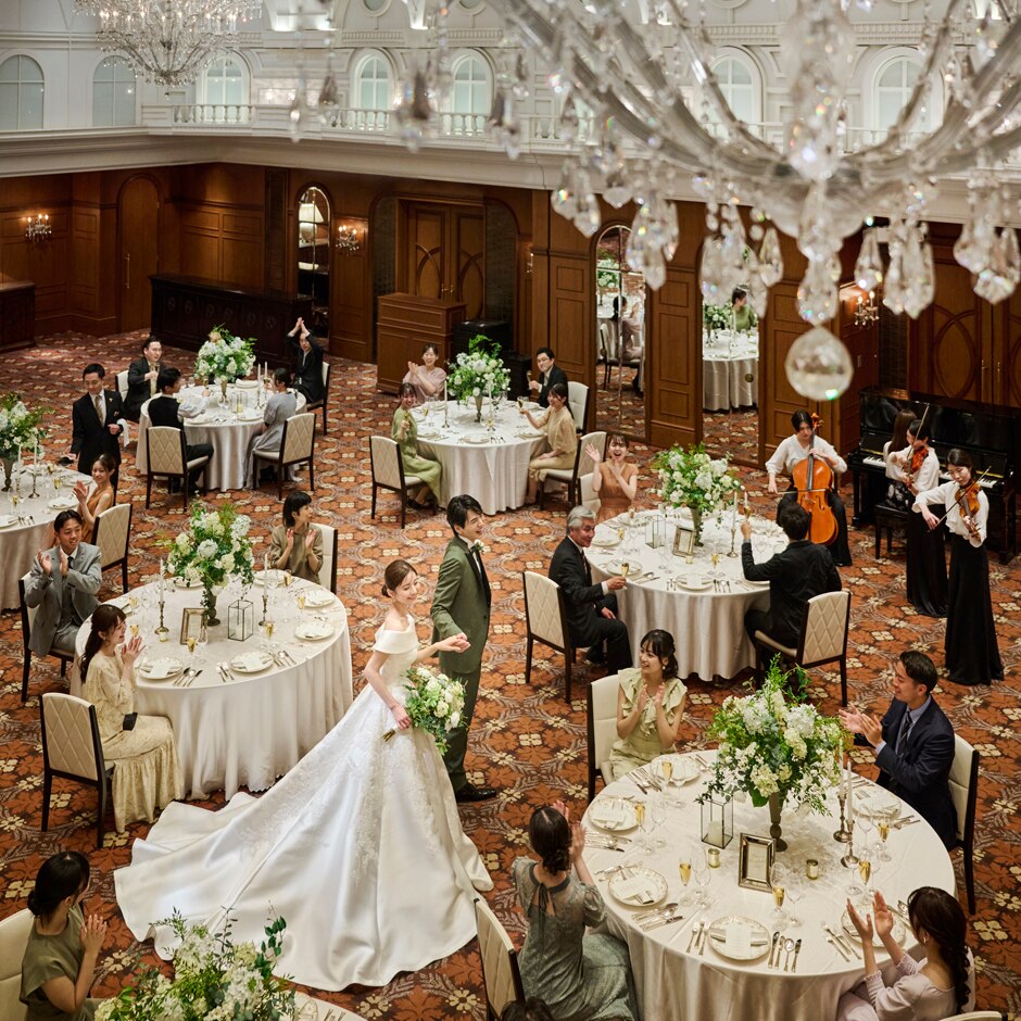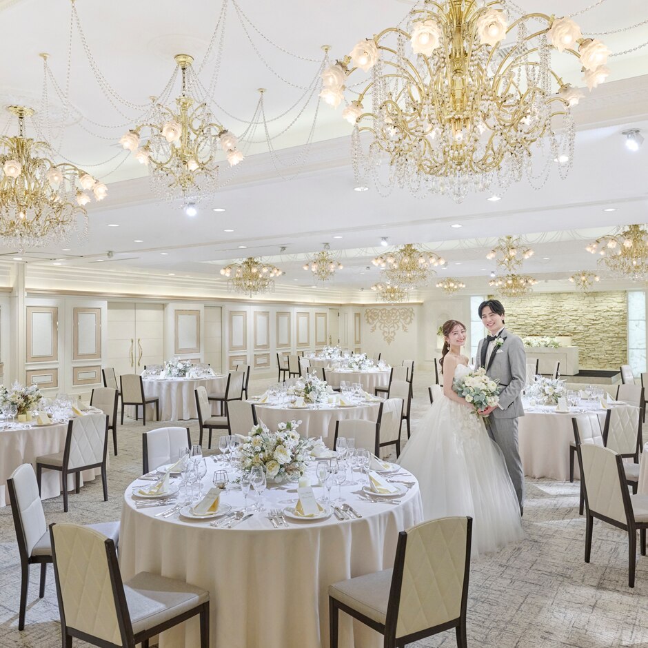 華やかに煌めくシャンデリアと解放感のある「ヴェルサイユ」。天井高は7m以上!豪華な披露宴が叶う、横浜最大級クラスのパーティー会場