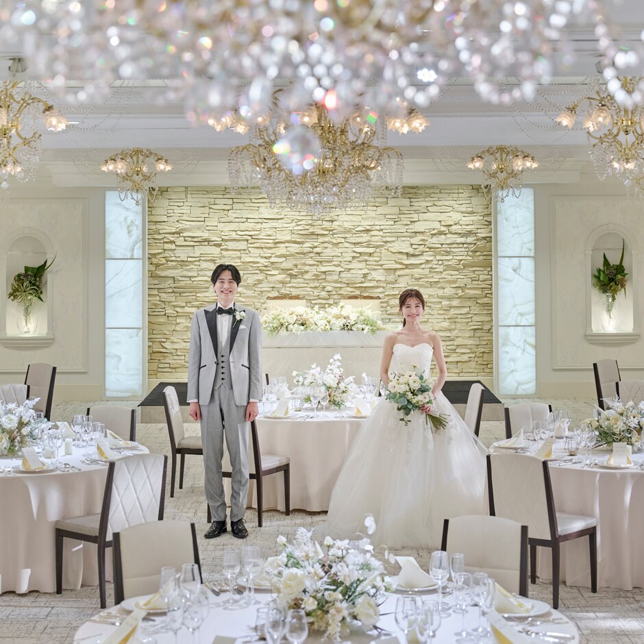華やかに煌めくシャンデリアと解放感のある「ヴェルサイユ」。天井高は7m以上!豪華な披露宴が叶う、横浜最大級クラスのパーティー会場