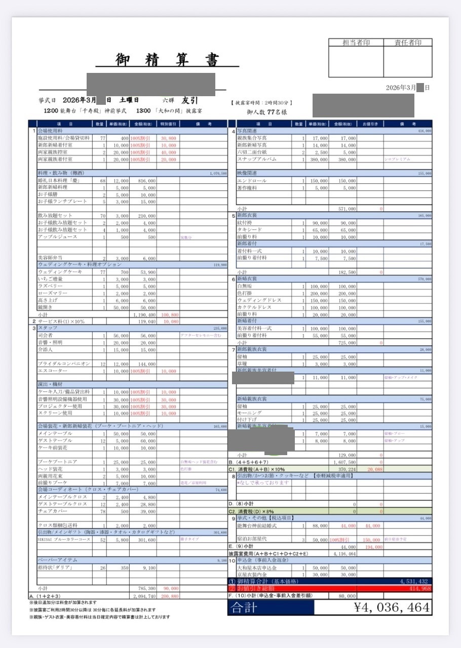 ※料金実例では申込金などを含む会場に支払った"総額"を表示しています。また、料金明細画像の項目名をもとに独自の基準で分類しています。