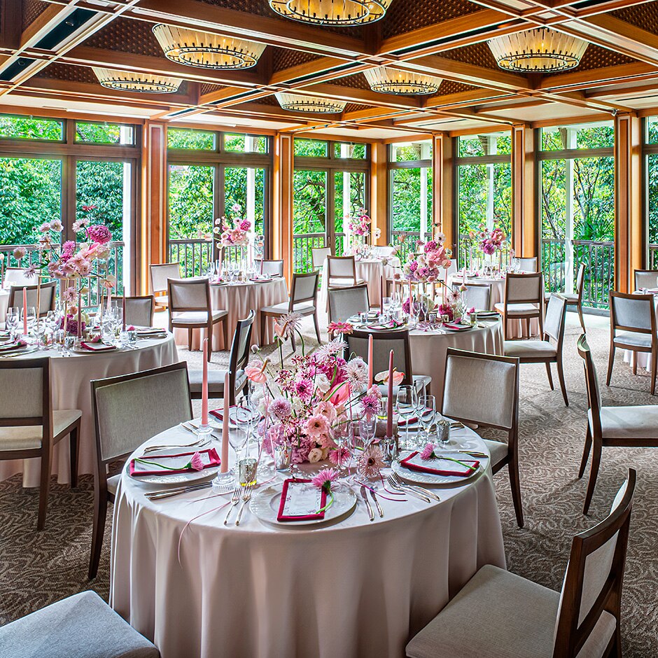 大きな窓からの自然光と緑が溢れる披露宴会場 -