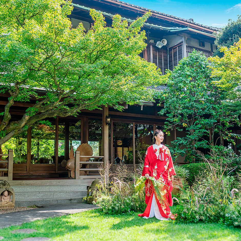 純和風邸宅は和モダンな情緒ある雰囲気が漂い、洋装はもちろん、和装もおすすめ。大切なゲストには、待合や披露宴会場からの眺望、四季に合わせて変わる年5回のメニューなど、たっぷりのおもてなしで感謝を伝えよう