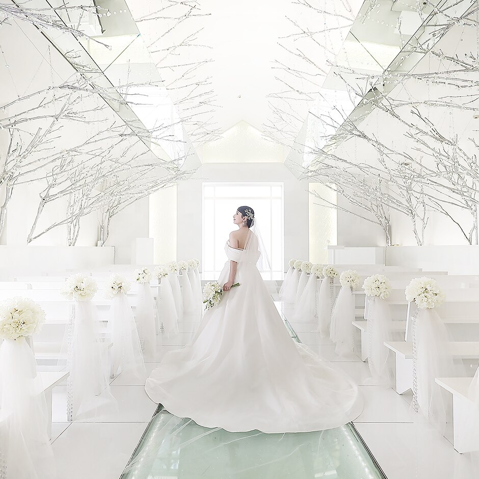 バージンロード、チャペルのフロア全面が 白く幻想的 -