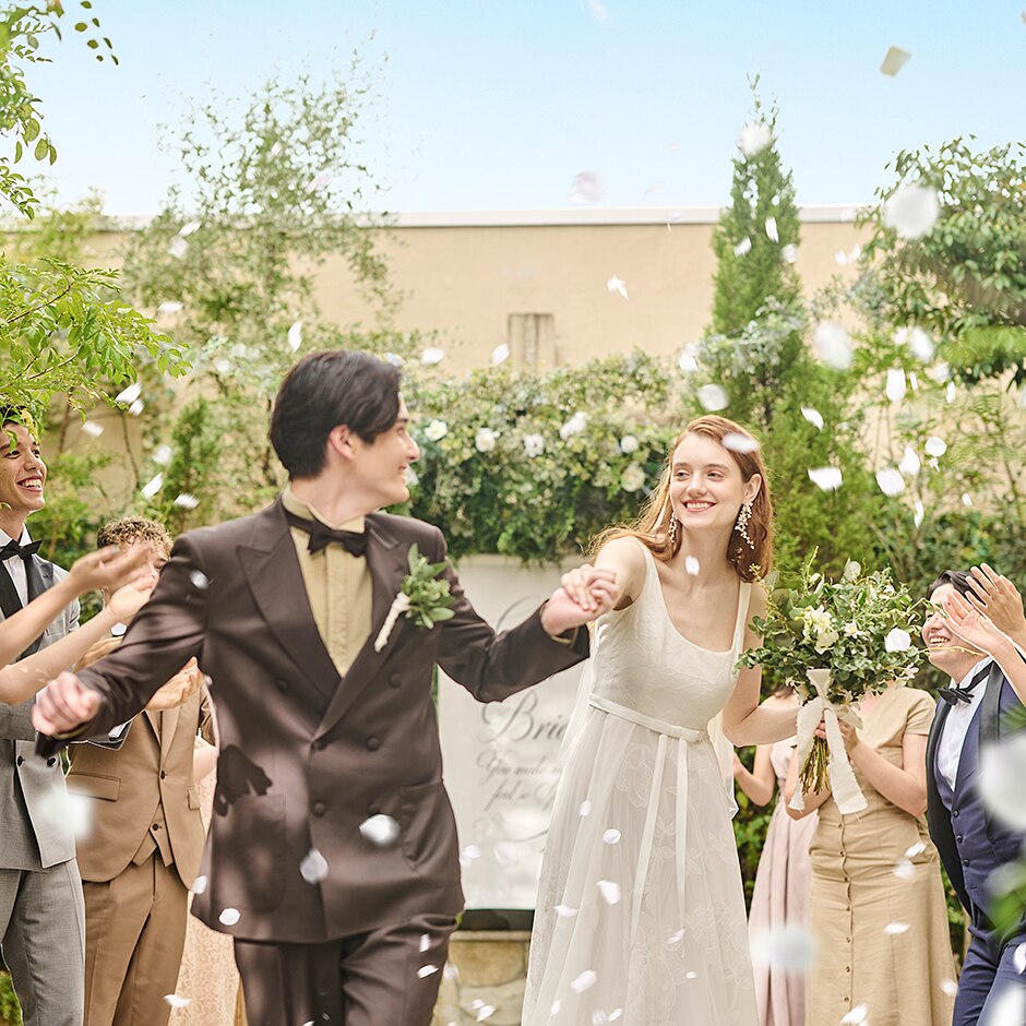 緑に囲まれたガーデンでフラワーシャワー。笑顔あふれる幸せの瞬間 -