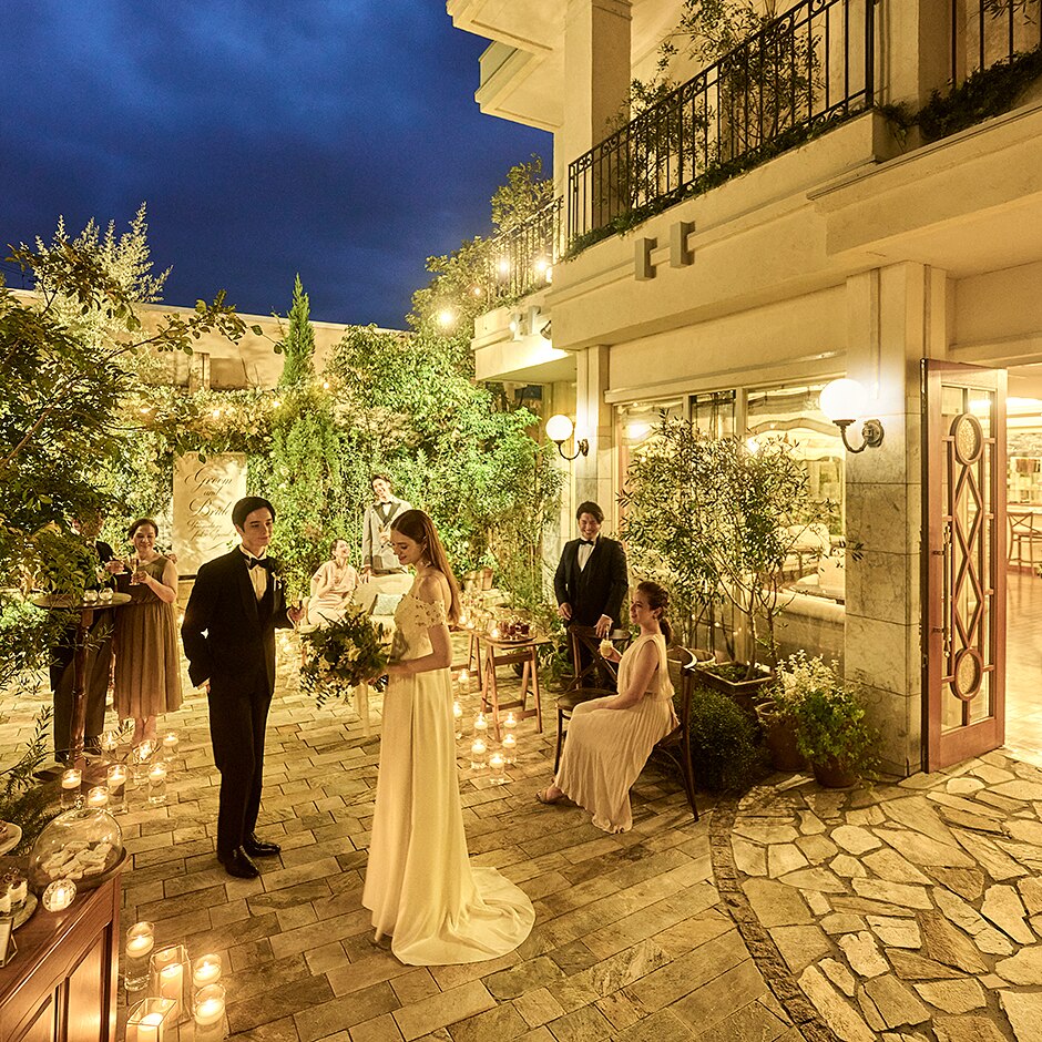 緑と温かなライトアップが織りなすナイトウエディング。ナチュラルでロマンチックな雰囲気が魅力。