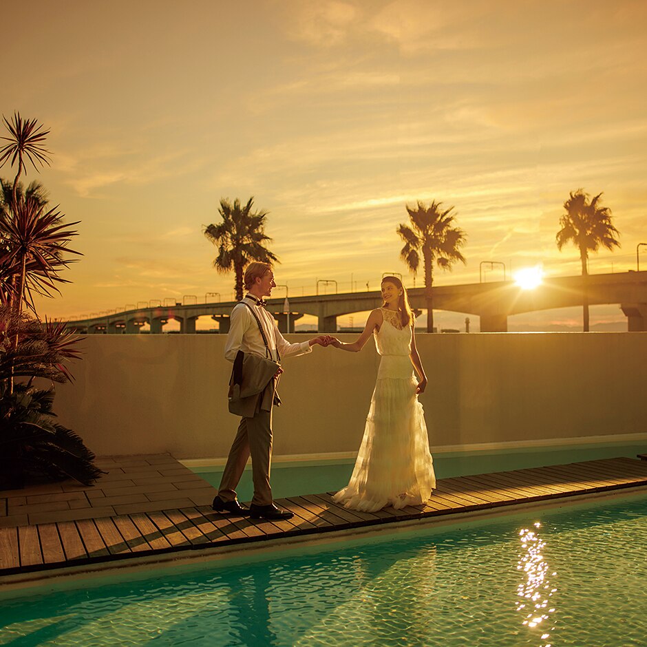 マンダリンポルト自慢のプール付ウォーターテラス。待合室と自由に行き来が可能で開放的!おふたりの結婚式をお待ちいただく時間も、ゲストに贅沢なリゾート空間をお楽しみいただくことが可能です♪