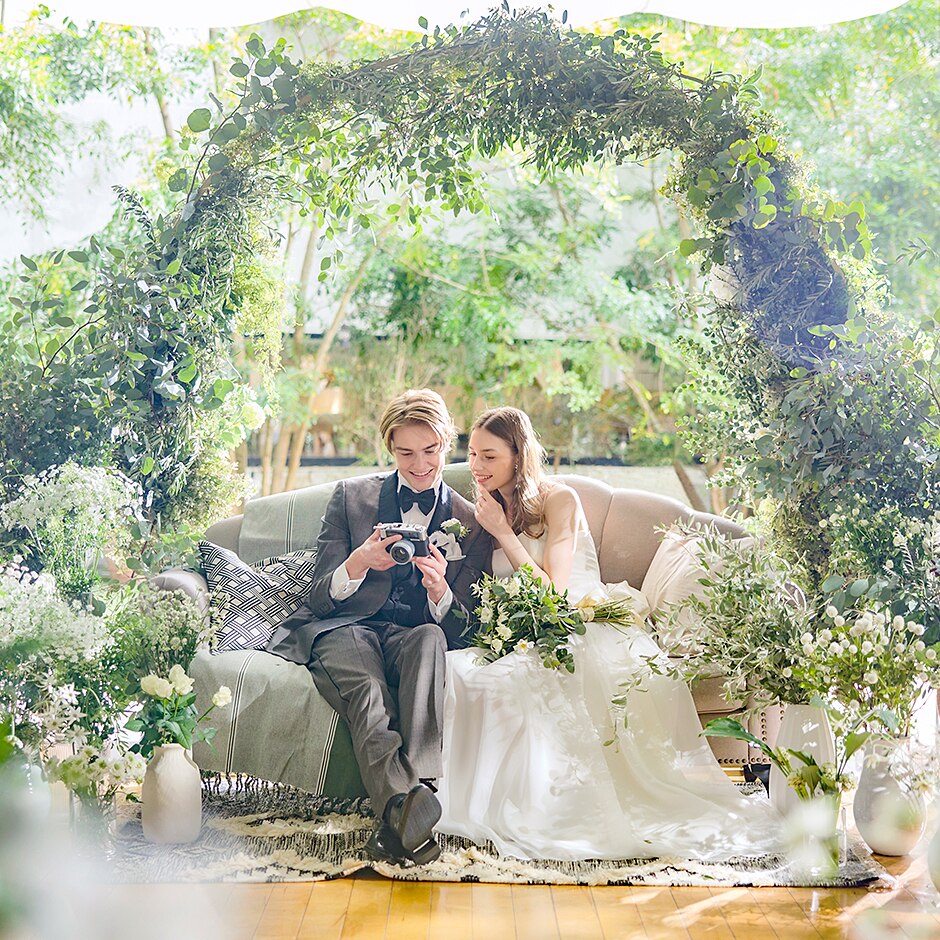 緑に囲まれたフォトジェニックなガーデン。パンパスのオシャレなアーチを背景に、家族や友人と撮影タイム。