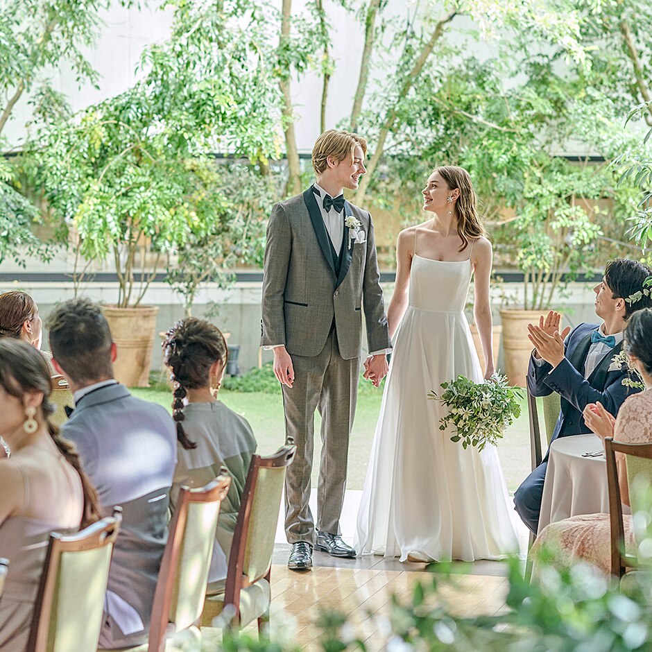 1年中、清々しい緑に囲まれたヴェールノアールならではの「ガーデン挙式」プライベート感もたっぷり!水の音が響く、リラックスした自然の雰囲気を感じながらの人前式。自然と笑顔がこぼれるセレモニーに