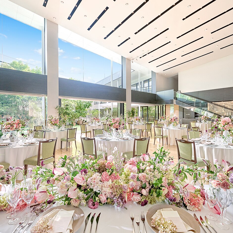 2階まで吹き抜けの天井と大きな窓が開放的なパーティ会場。隣接したガーデンと自由に行き来できる。130名まで収容できる広さで、オープンキッチン付き。シェフたちのパフォーマンスも演出のひとつに