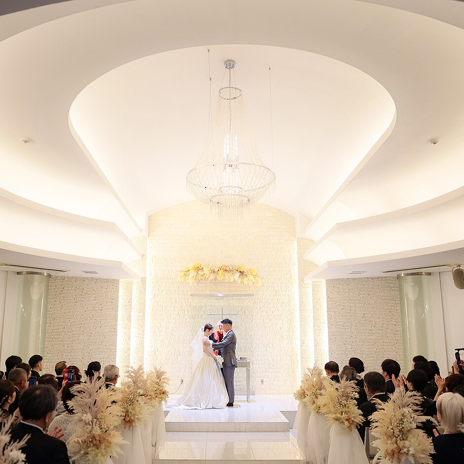 ゲストの視線が自然とふたりに集まる円形のチャペルは、透明感のある上質な空間。大切な人から想いを受け取るベールダウンは、「今まで育ててくれてありがとう」という感謝で涙が溢れる、感動的で特別なシーンに
