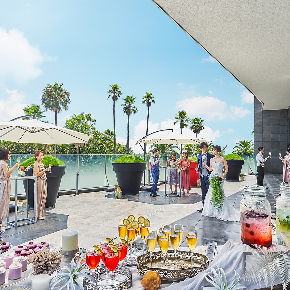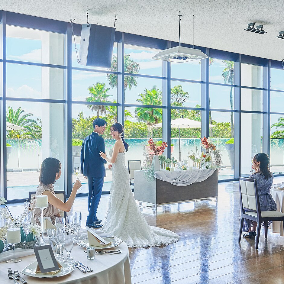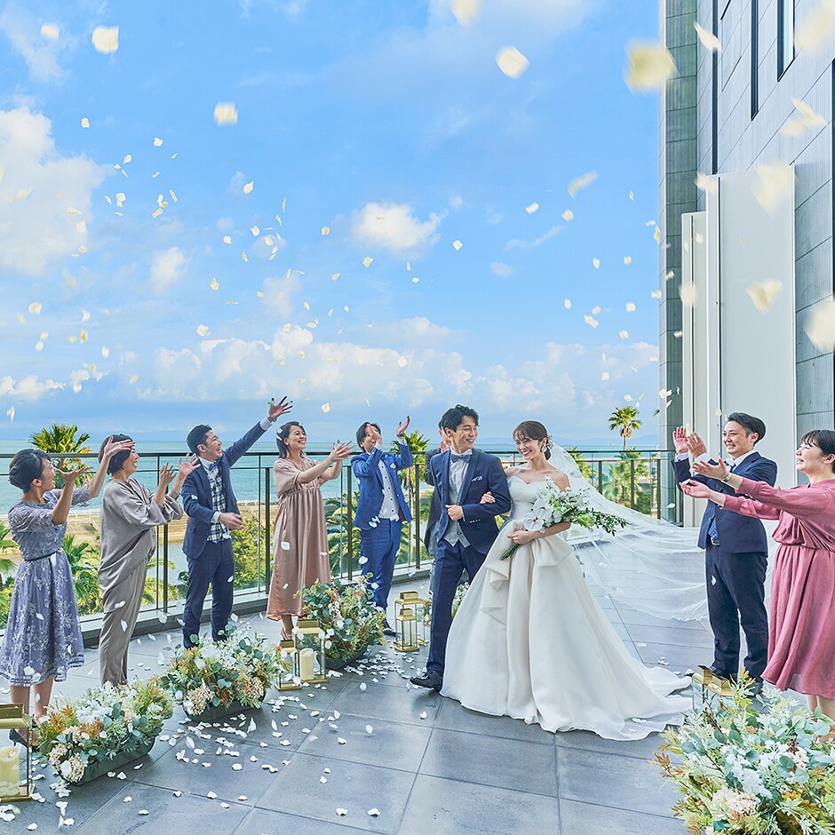 煌めく錦江湾と雄大な桜島を望むベイサイドエリアの上質空間を貸切にするウエディング。海外リゾートのラグジュアリーホテルを思わせるような陽が注ぐ心地よい邸宅は、ふたりの大切な人を招くのにふさわしい場所。
