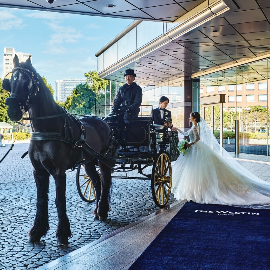 ヨーロッパの雰囲気漂うホテルらしい演出、それは式後にホテル正面にオリジナルのカーペットが敷かれ、ふたりを待つ馬車に乗ってパレードをするというもの。憧れの世界が現実になる特別な瞬間はゲストの心にも残る