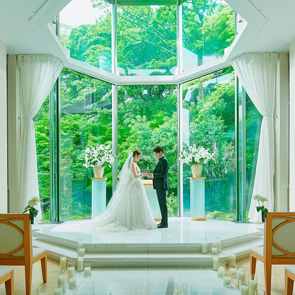 澄み渡るような透明感が開放的なクリスタルチャペル「ルミエール」。天窓から射し込む自然光に純白の大理石が輝き、聖壇の奥に望む豊かな木々の色彩が、ふたりの誓いの瞬間をより印象的なシーンへと演出する