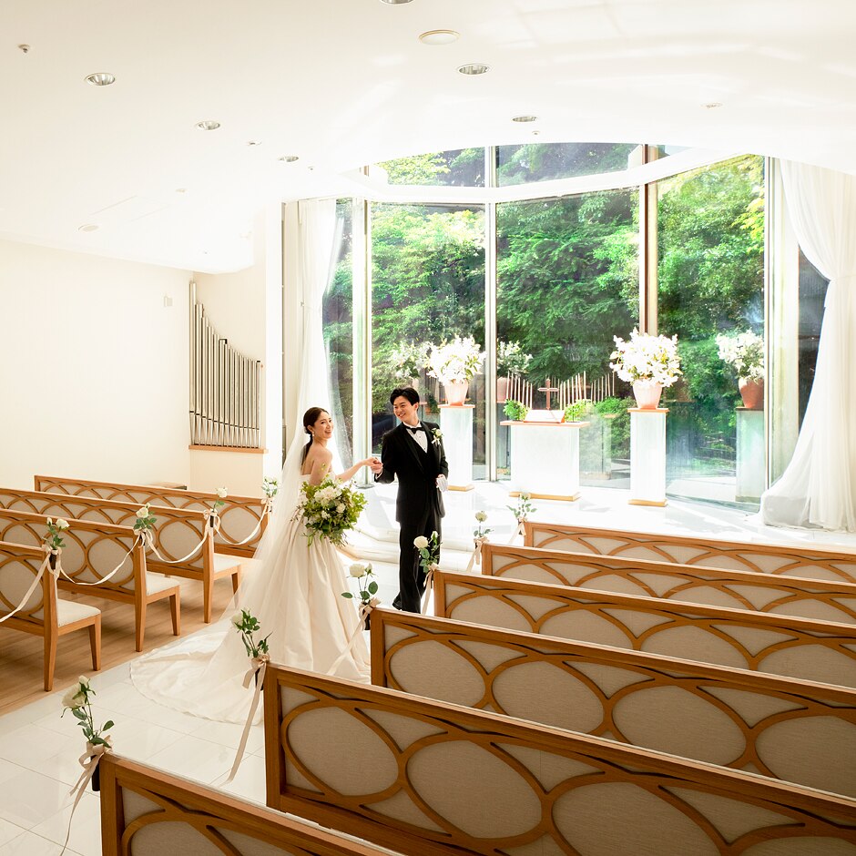 澄み渡るような透明感が開放的なクリスタルチャペル「ルミエール」。天窓から射し込む自然光に純白の大理石が輝き、聖壇の奥に望む豊かな木々の色彩が、ふたりの誓いの瞬間をより印象的なシーンへと演出する