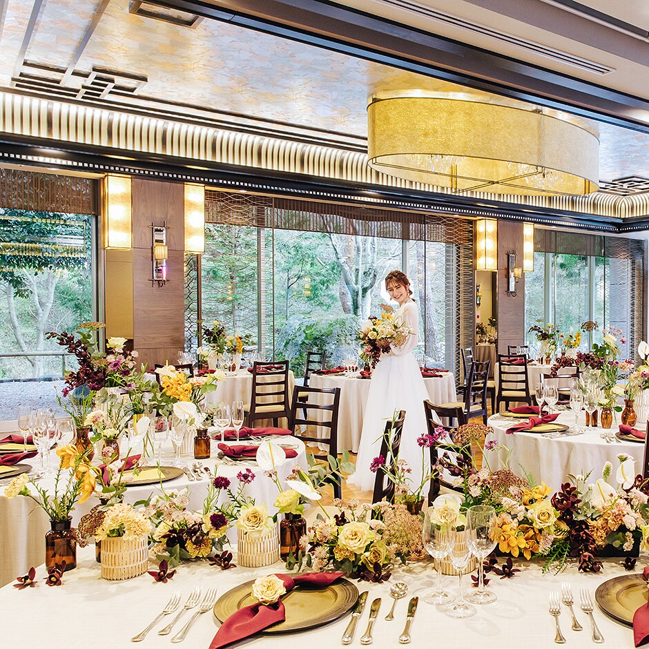 2面を大きな窓に囲まれ、外には四季の美しい自然が広がる明るいバンケット【ガーデンテラス】や、こだわりの演出が叶う【マーヴェラス】、少人数に最適な【シンフォニー】など好みのスタイルに合わせた会場を選べる
