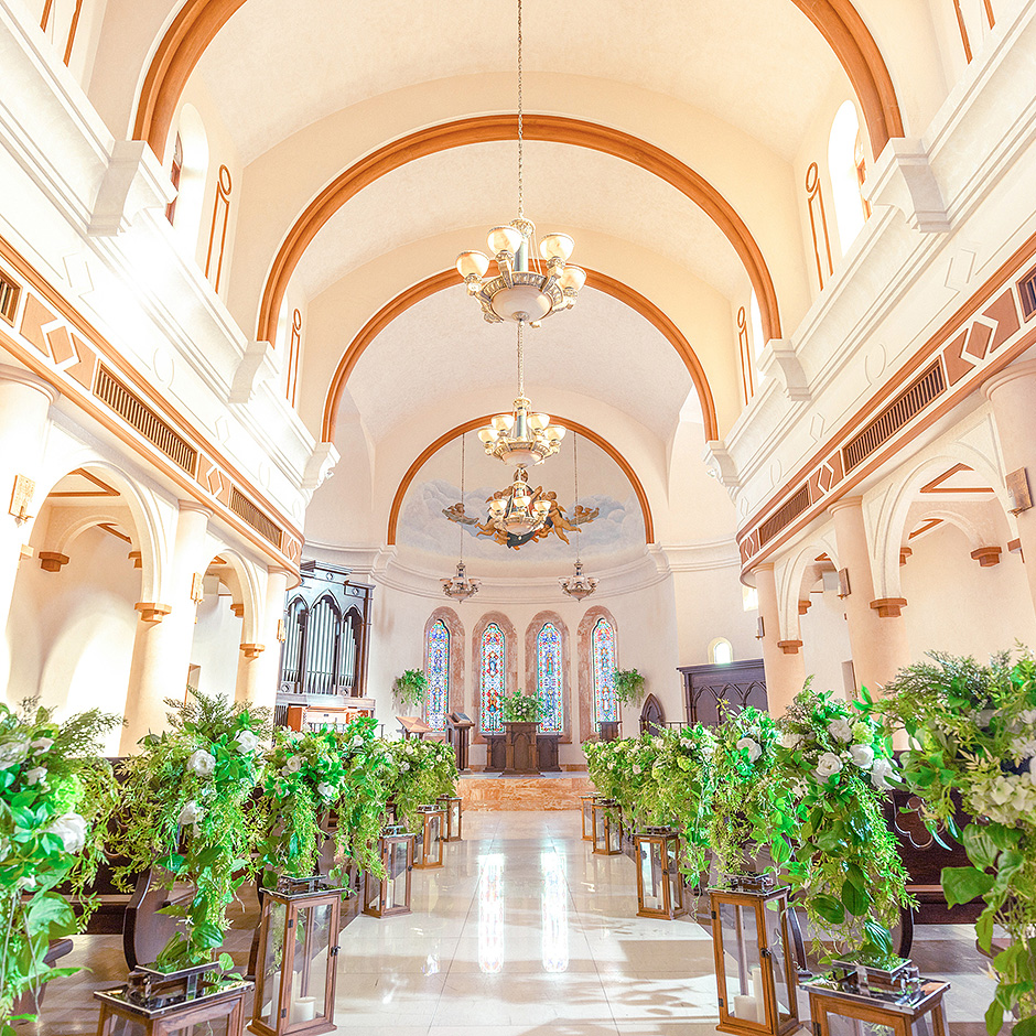 イタリアから受け継がれた美しく繊細なステンドグラスがきらめく大聖堂にはパイプオルガンも備わっており、木漏れ日差し込む開放的な空間で「家族の絆」を感じる挙式が叶えられる。