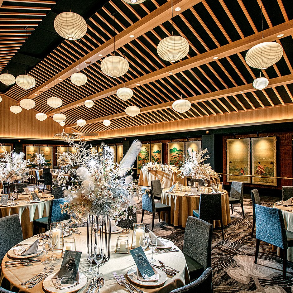 <少人数から大人数まで柔軟に対応>伝統とトレンドが融合した和モダンの【寿の間】、少人数専用の【梅の間】、リニューアルする【牡丹の間】など 5 つの披露宴会場から、ふたりのテーマに合わせて選べる。