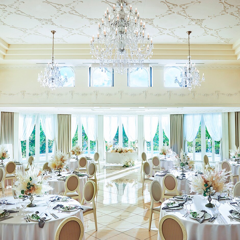 中央のシャンデリアがひときわ目を引くバンケット。純白の会場はふたりの好みに合わせてコーディネートも自由自在。プール付きプライベートガーデンが隣接していて演出の幅も広がる