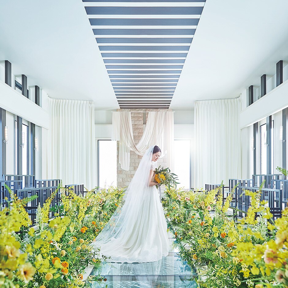 全長12mのバージンロードを歩む花嫁を、天窓から降り注ぐ光が優しく包み込む「光のチャペル」。高さ8mの開放感あふれる空間に映える、ホワイトのコーディネートが、ふたりの誓いをよりドラマチックに演出する
