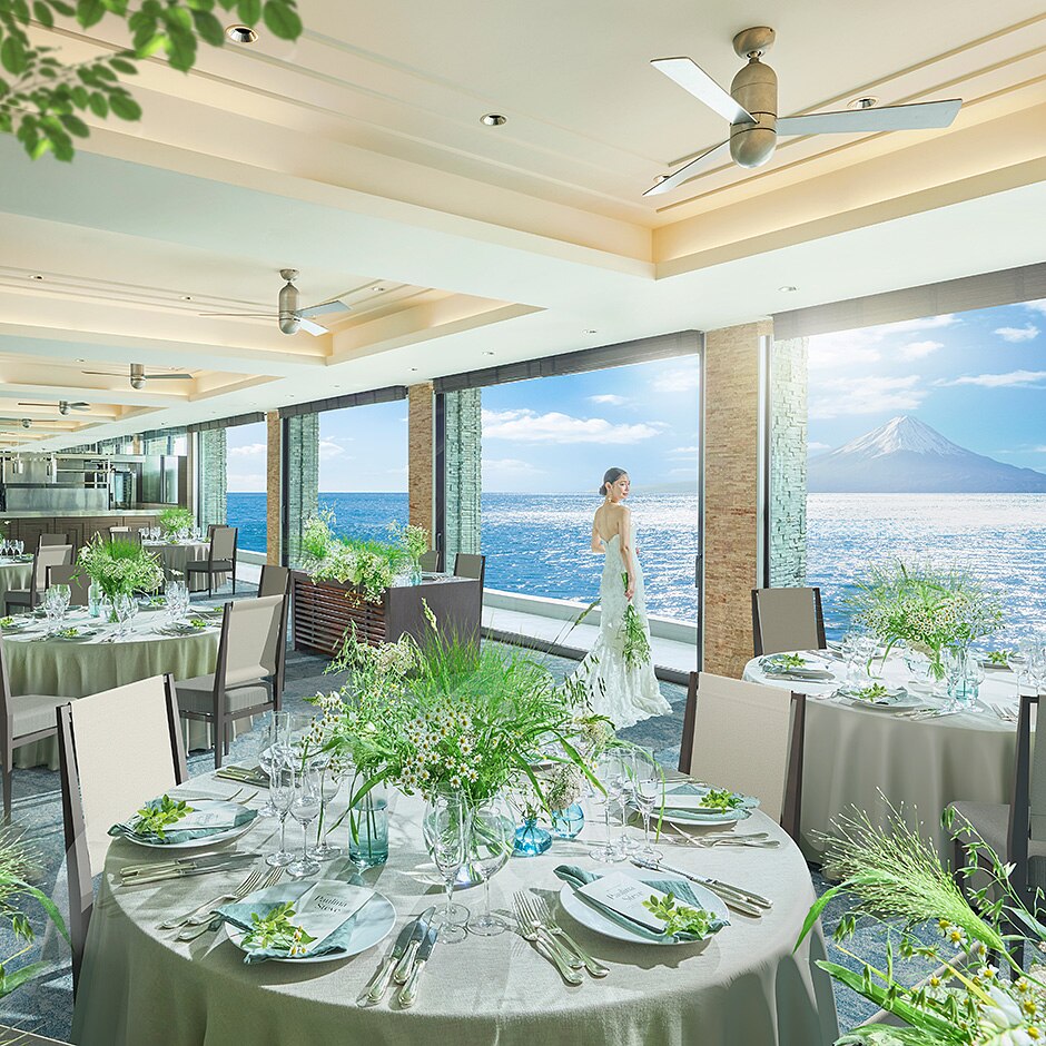 大切なご家族様を招く披露宴会場は、ふと目線をあげるとどこまでも続く碧の絶景が広がる最高のロケーション。水平線の奥には富士山も佇み、唯一無二の美しい景色は年齢層幅広く好評。美しい絶景に思わず会話も弾む。
