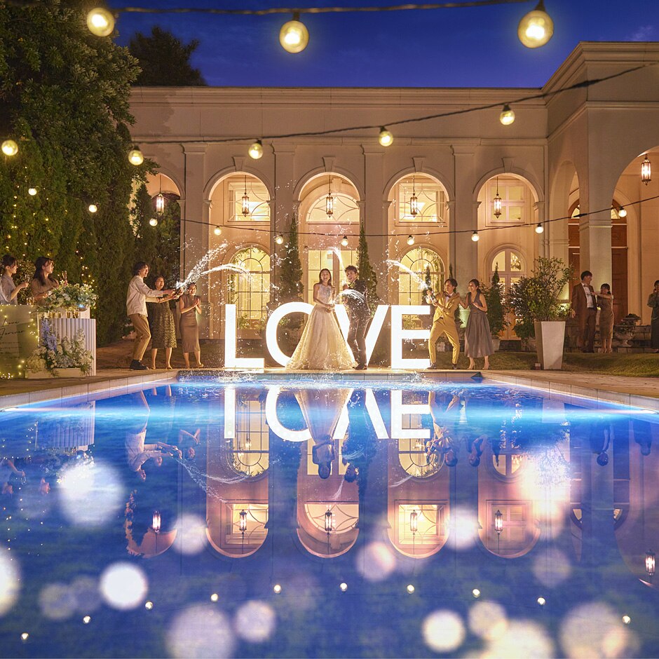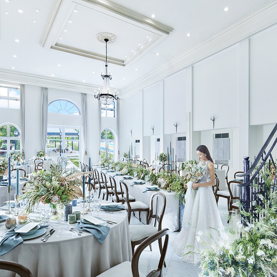 緑豊かな敷地とプール付きガーデン、青いバージンロードが際立つ純白のチャペルなど、新婦の好みが溢れた会場!ロビーを中心にチャペルと披露宴会場が隣接した邸宅を1棟貸切にでき、年配ゲストや子どもが安心して過ごせることも理想にマッチ。「豊富な演出を楽しめる広々とした会場、スタッフの柔軟な対応も決め手です」。