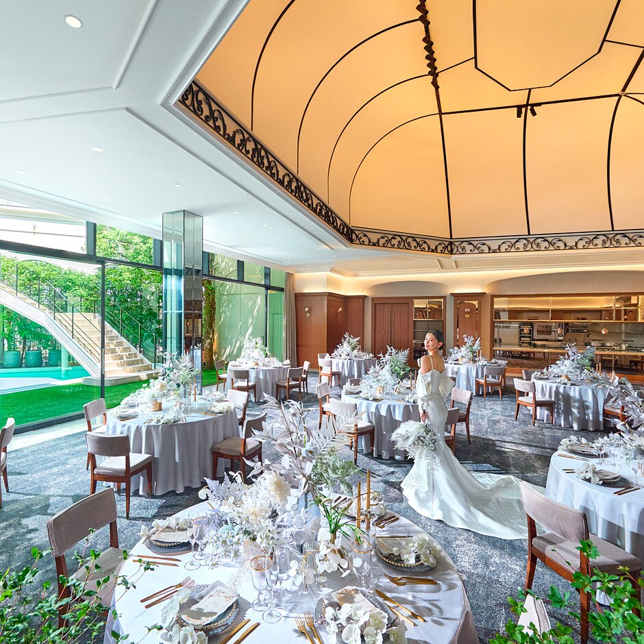 緑に囲まれたプール付ガーデンは、同会場でも注目したいスポット。高さある大階段が、一瞬で非日常感溢れる特別な世界へと花嫁を誘う。一軒家貸切だからこそできる、ふたりらしい自由なガーデンの使い方を考えてみて