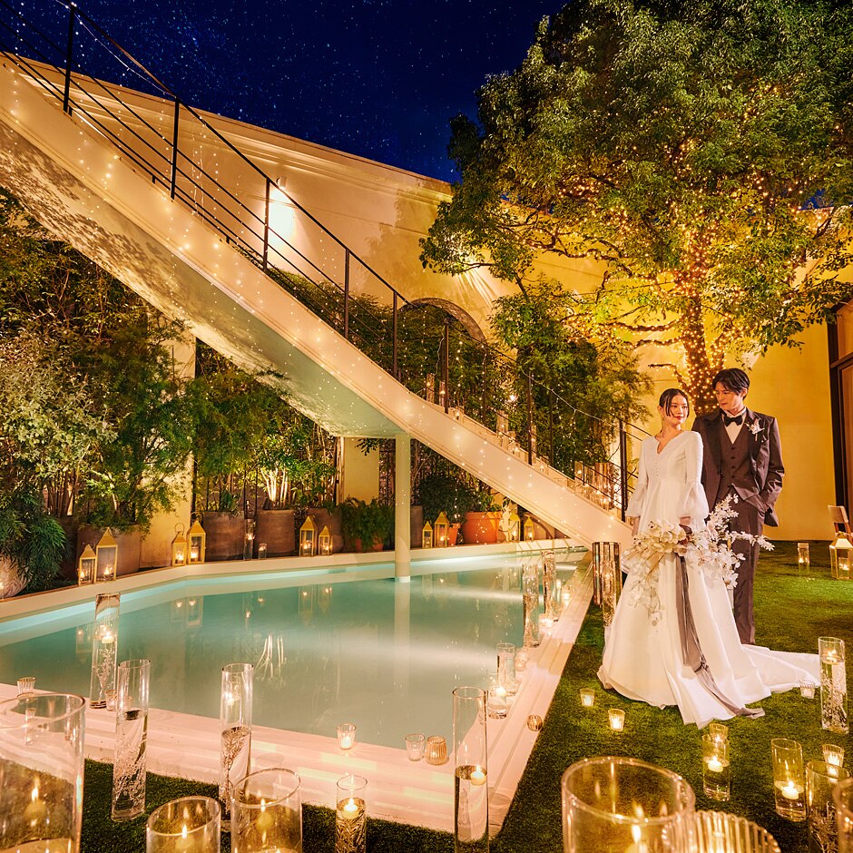 ナイトタイムのガーデンは、プールの水面に景色が映り込み、ロマンチックな世界観に