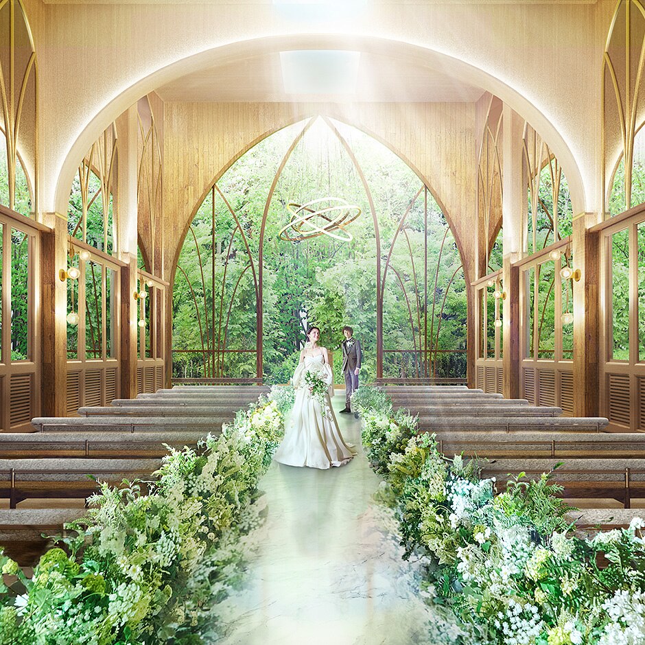 扉を開いた瞬間、まるで森のなかにいるような木のぬくもりと祭壇に広がる緑が非日常感を演出するチャペル。大理石のバージンロードや絆を感じる輪が連なったシャンデリアなど、上質感も漂う空間。※完成予想図
