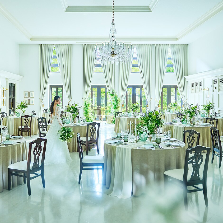 大きな窓からのぞくプライベートガーデンの鮮やかな緑と、差し込む太陽の光によって、心地よい開放感に満たされたパーティ会場。上品で落ち着いた印象ながらも自然に心癒される温かな空間で、上質なひとときを。