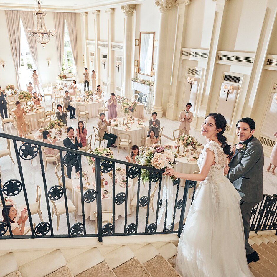 階段から入場するのが憧れだった新婦は、見学時に映画のワンシーンのような体験ができたことに感激。2つの会場から選べる点と、バルーン演出ができるガーデンのプールも決め手に。また、スタッフが名前を呼んで出迎えてくれたり、ふたりが好きな曲を流してもらったりと、温かい心遣いが光るおもてなしも印象に残った。