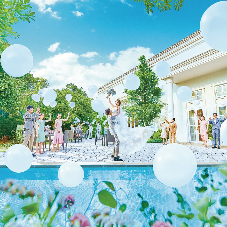 水と光が溢れるプールガーデン付の貸切邸宅で過ごす一日で、主役感満載のウエディングを。太陽の光でキラキラと煌めく水面を眺め、青空の下で過ごす時間は生涯忘れられない特別なひとときを叶えてくれる。