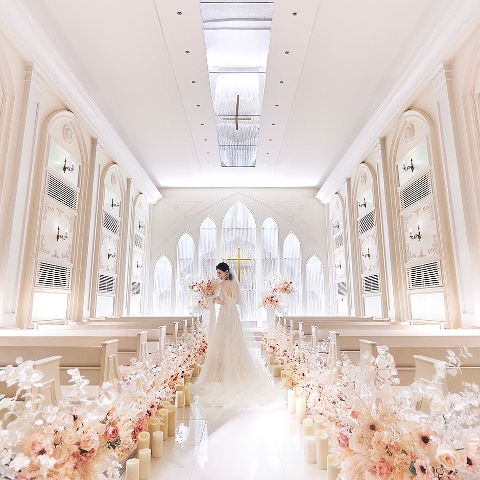 100万粒のクリスタルが印象的な祭壇と、白で統一されたピュアな空間が、花嫁のドレス姿を引き立てる。