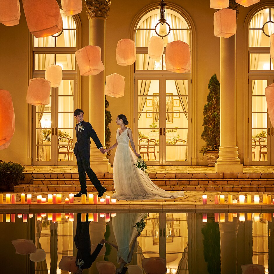 ナイトタイムのガーデンは、プールの水面に景色やキャンドルの灯りが映り込み、ロマンチックな雰囲気でお洒落にパーティを楽しめる。日中とは一味違う、ゲストの記憶に強く残るナイトウエディングもおすすめ!