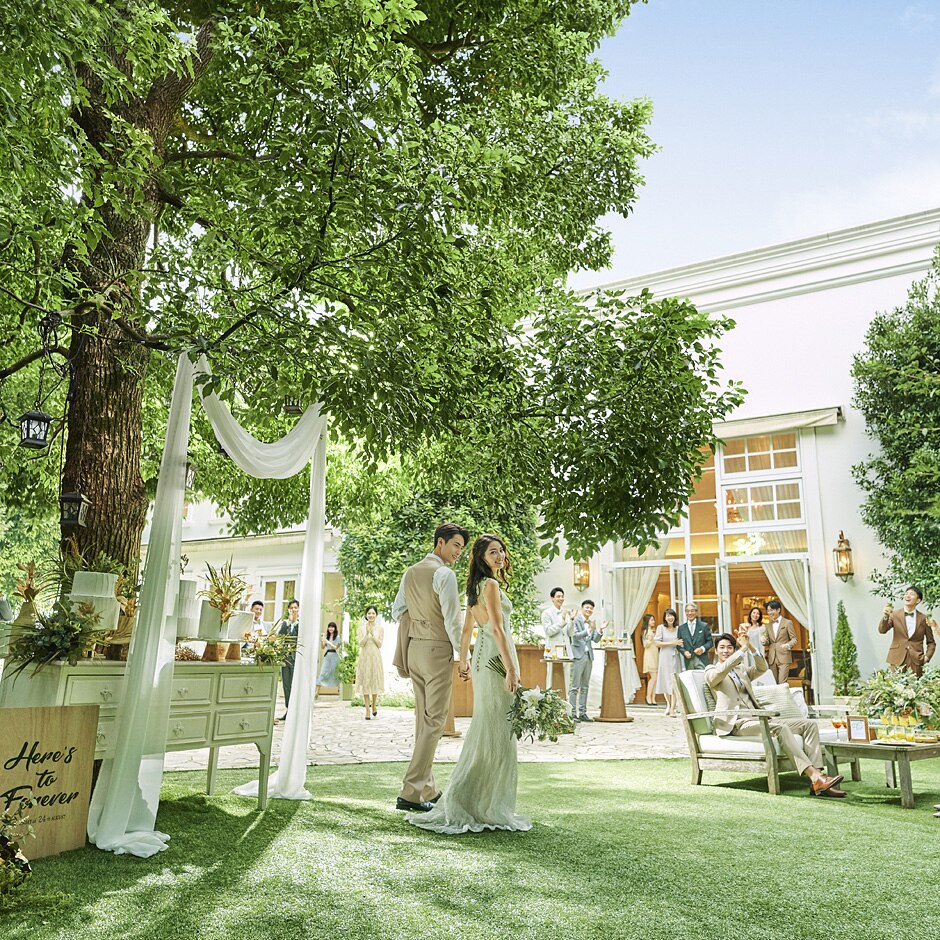 広大なプライベートガーデンを独占できるからこそ叶う、開放感溢れるアフターセレモニーが人気。