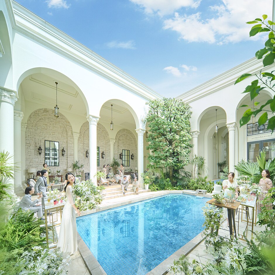 ガーデンを中心にチャペルやパーティ会場がレイアウトされた邸宅。煌めくプールに青空がうつり込む開放的な空間をふたりとゲストで独占。オシャレなアイテムや小物で飾り付けて、特別な1日を過ごして。