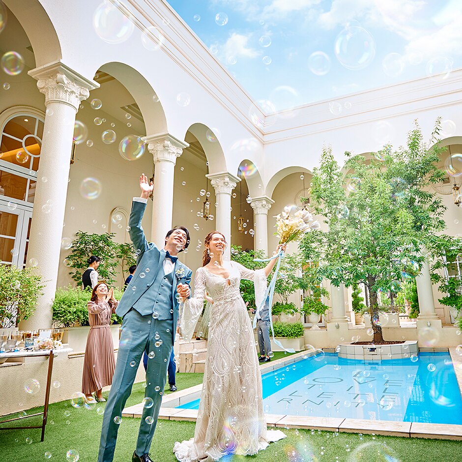 ガーデンを中心にチャペルやパーティ会場がレイアウトされた邸宅。煌めくプールに青空がうつり込む開放的な空間をふたりとゲストで独占。オシャレなアイテムや小物で飾り付けて、特別な1日を過ごして。