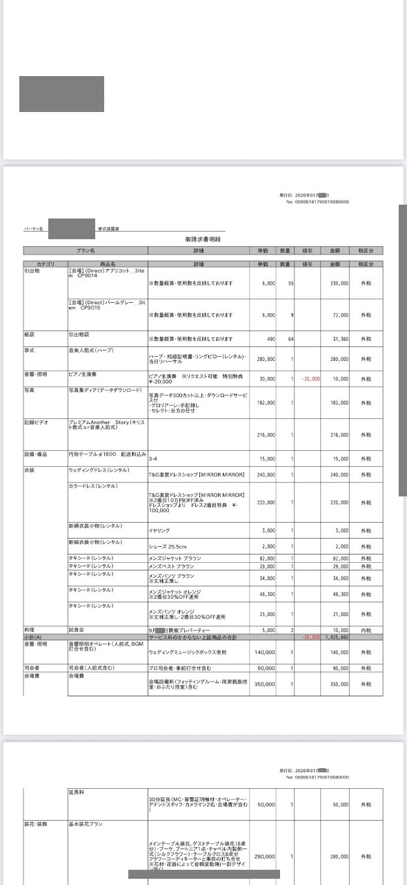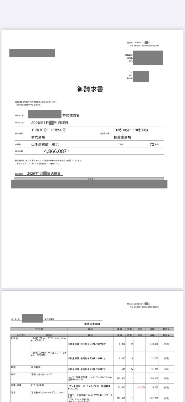 ※料金実例では申込金などを含む会場に支払った"総額"を表示しています。また、料金明細画像の項目名をもとに独自の基準で分類しています。