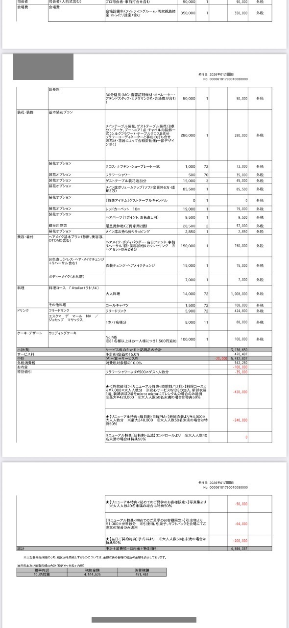※投稿された金額情報は、日取り、申込みのタイミングや会場の空き状況等によって異なるため、最終費用明細の項目や金額をもとにした、式場との価格交渉や追加サービス等の要望はご遠慮ください。
