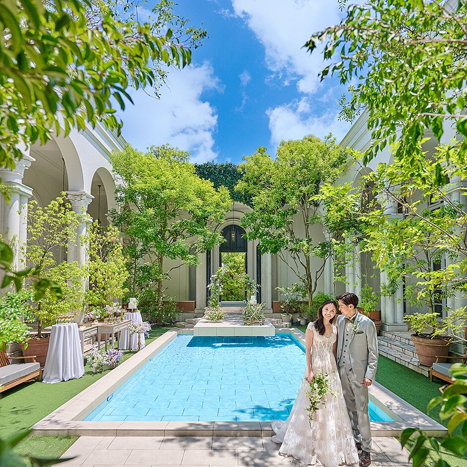 プール付きのプライベートガーデンは、パーティ会場と隣接しているので、自由に行き来する動きのあるパーティが叶う!自然を感じるくつろぎの空間で、デザートブッフェや写真撮影など様々な演出を楽しめると好評!