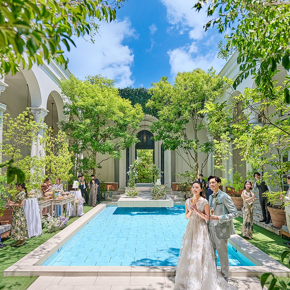 プール付きのプライベートガーデンは、パーティ会場と隣接しているので、自由に行き来する動きのあるパーティが叶う!自然を感じるくつろぎの空間で、デザートブッフェや写真撮影など様々な演出を楽しめると好評!