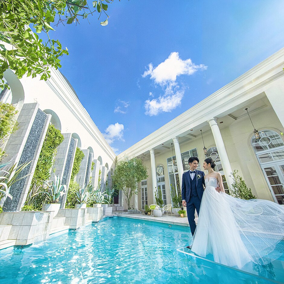 凱旋門をくぐると、水音奏でるプール付きガーデンが目の前に広がる。洗練された一軒家を1組で貸切にして、ゲストとふれあうパーティに。タクシー送迎付だから、ゲストが安心して訪れられるのも魅力。1軒目見学でギフト1万円+30万円相当の成約特典付。