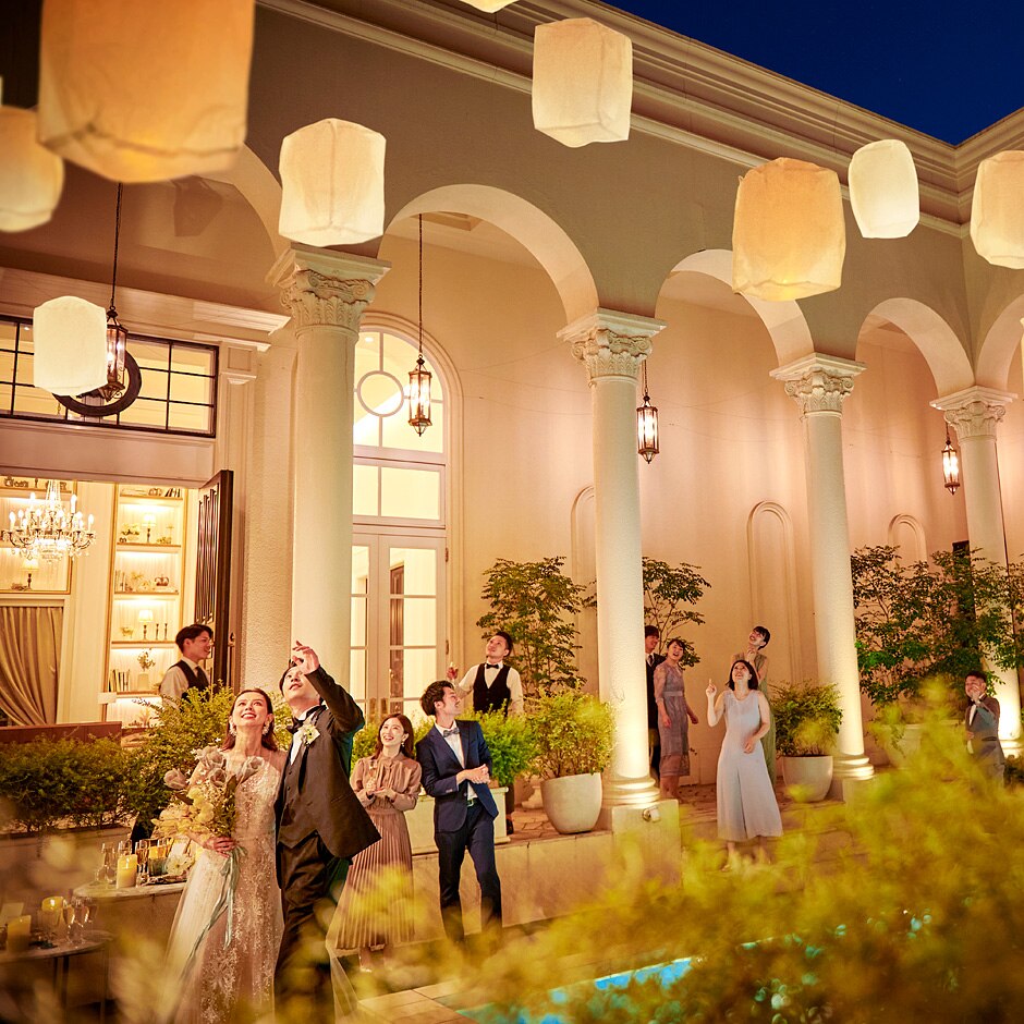 キャンドルやイルミネーションの輝きに包まれて、ナイトタイムは優雅な雰囲気へと表情を変える。まるで海外ウエディングのような非日常に満ちた空間や、ナイトならではの演出で、思い出に残るシーンを叶えて。