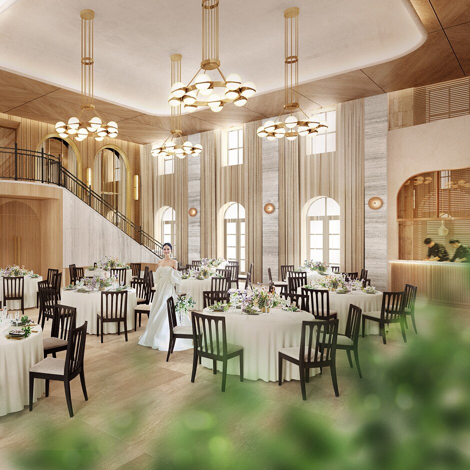 温かな木の質感が印象的な、ナチュラルながらも華やかなパーティ空間へとリニューアル!ゲストを包み込む柔らかな陽光、広々とした開放的な空間が、特別な一日をよりドラマティックに演出してくれる※完成予想図。