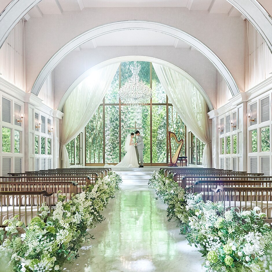 陽光と緑が彩る美しいチャペル。祝福の眼差しに包まれる中、光り輝く大理石のバージンロードを歩み祭壇へ。