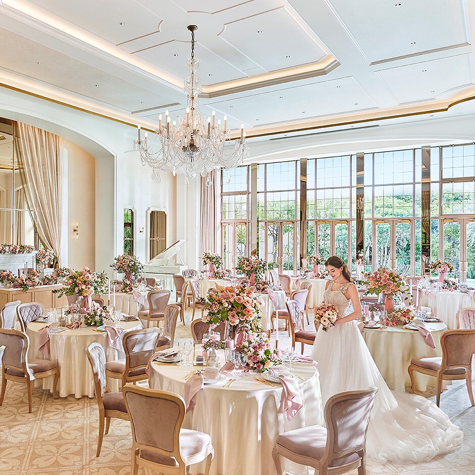 天井には大きなシャンデリアが輝き、上質なドレープやヨーロピアンな雰囲気漂うインテリアが、ふたりのパーティを華やかにしてくれる。窓の外に見える瑞々しい緑に包まれて優美な時間を過ごそう。