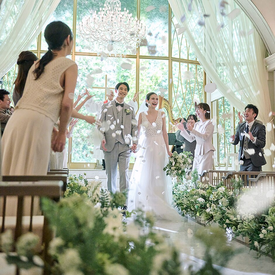 今までのめぐり逢い、そしてこれからの人生の始まりを祝福するチャペル【栞(SHIORI)】。ゲストとの距離が近く歓声や祝福を間近で感じることができる。感動の挙式後はフラワーシャワーの演出で幸せをシェアしよう。