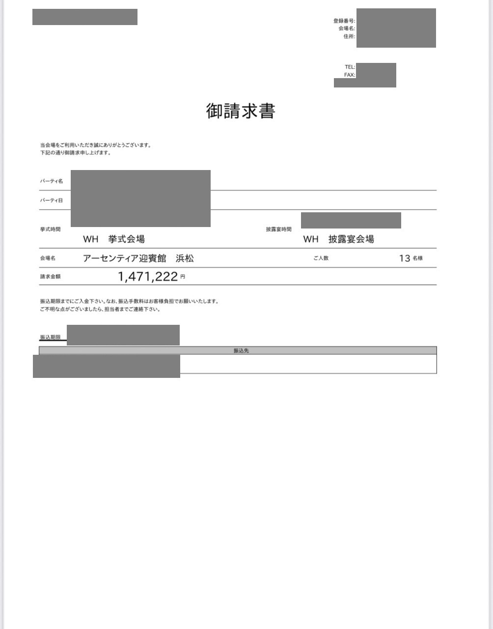 ※料金実例では申込金などを含む会場に支払った"総額"を表示しています。また、料金明細画像の項目名をもとに独自の基準で分類しています。