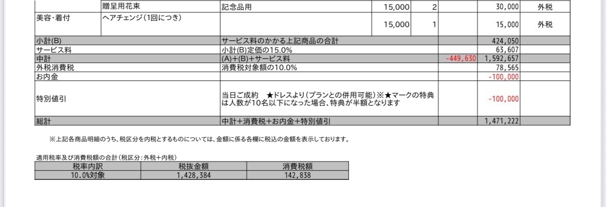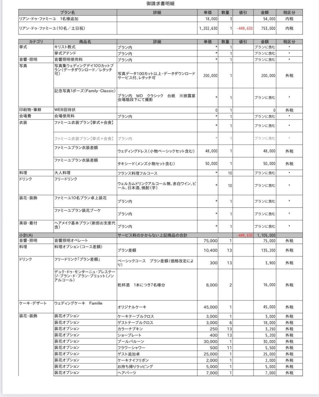 ※投稿された金額情報は、日取り、申込みのタイミングや会場の空き状況等によって異なるため、最終費用明細の項目や金額をもとにした、式場との価格交渉や追加サービス等の要望はご遠慮ください。