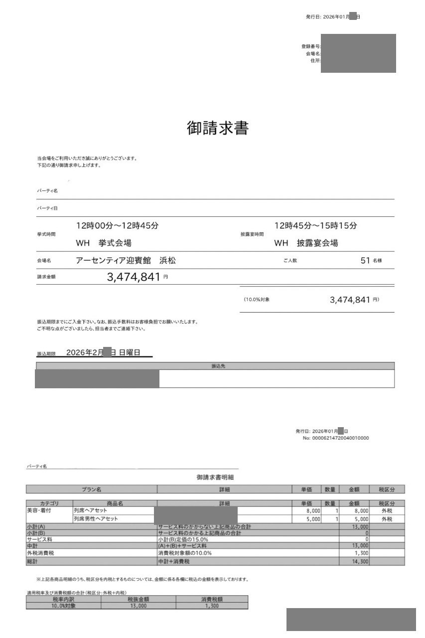 ※料金実例では申込金などを含む会場に支払った"総額"を表示しています。また、料金明細画像の項目名をもとに独自の基準で分類しています。